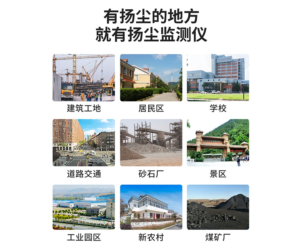 可測粉塵/氣體:工業(yè)/在建工程/居民區/商業(yè)區/道路交通/物料堆放區等場(chǎng)所揚塵